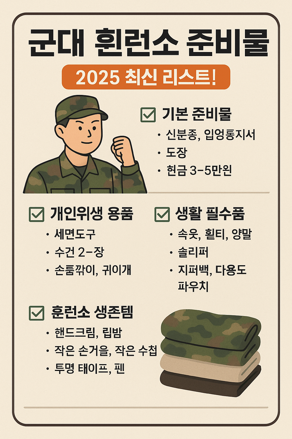 2025년 최신 기준, 군필자들의 경험을 바탕으로 한 훈련소 준비물 리스트를 정리했습니다. 지금부터 꼼꼼하게 체크해보세요!