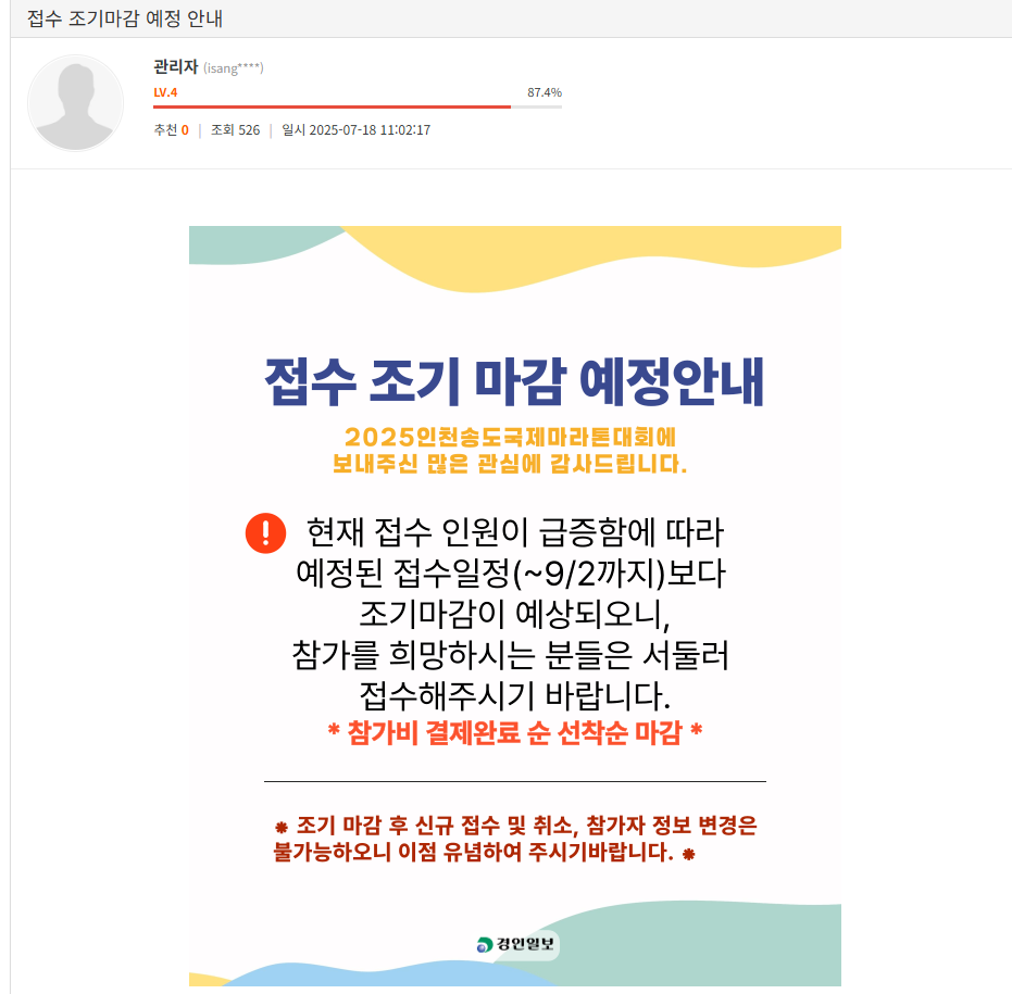 현재 2025. 7. 22(화) 기준으로 2025 송도국제마라톤 공식홈페이지에서는 접수 조기마감 안내가 되어 있으니