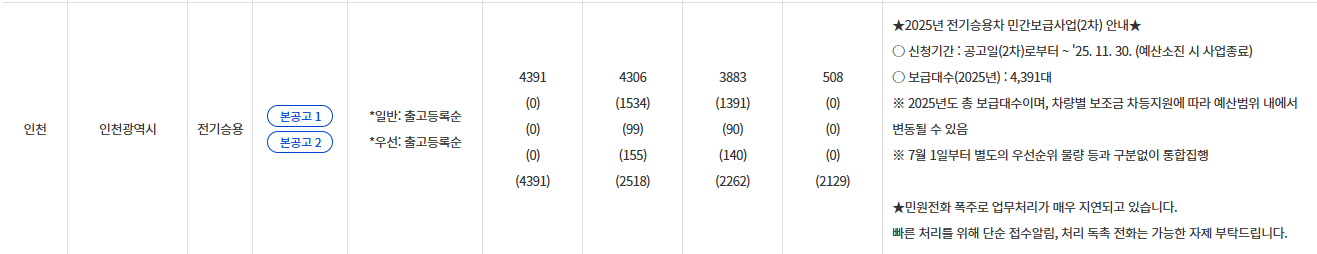 글을 작성하고 있는 오늘(2025. 7. 22) 기준으로 인천광역시 전기차 보조금 지급이 가능한 잔여대수는